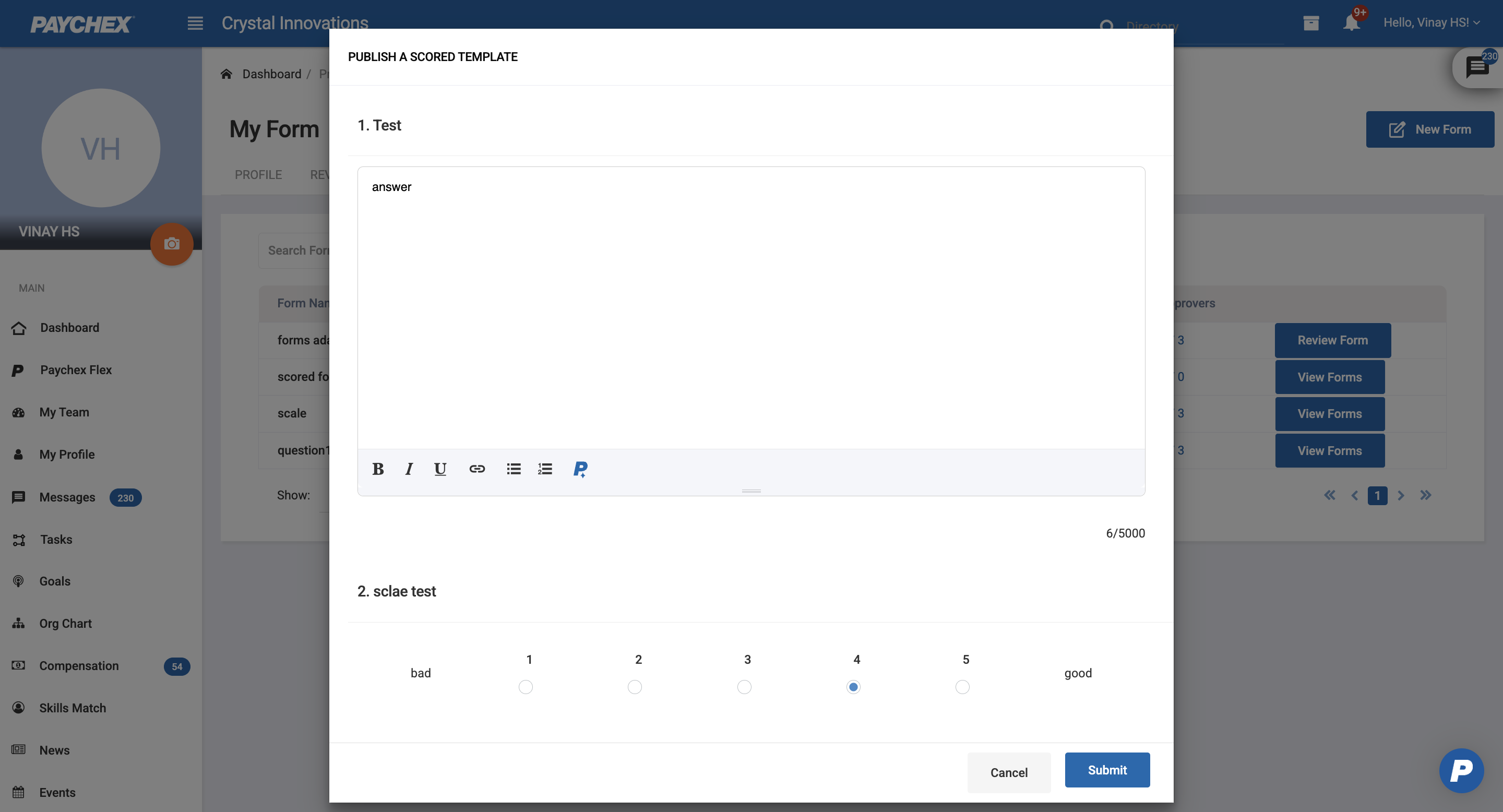 Users with access to the Forms module can create new form submissions either on themselves (Employees) or on their direct reports (Managers). The process for submitting a form is consistent across both user types.