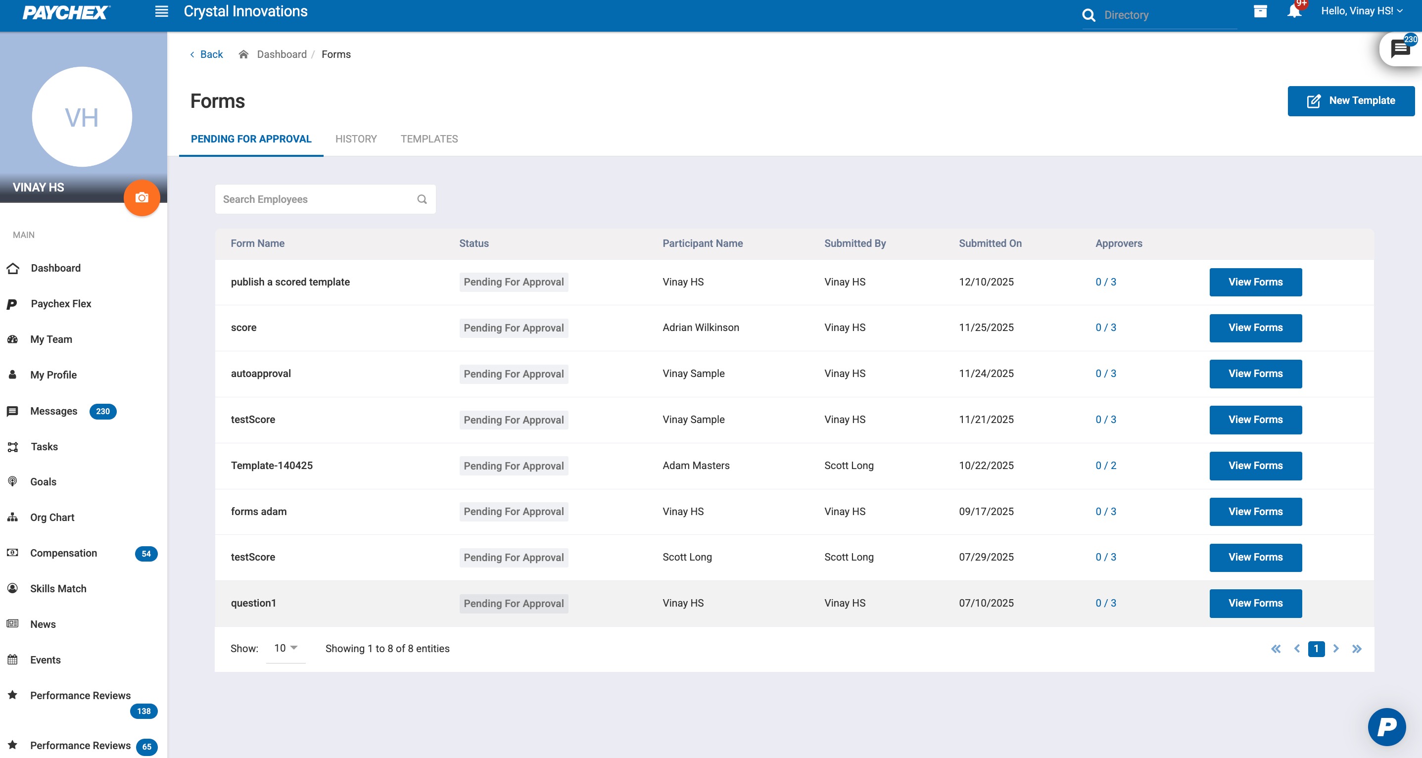 A list of all forms awaiting approval is displayed, including Approver(s) list.