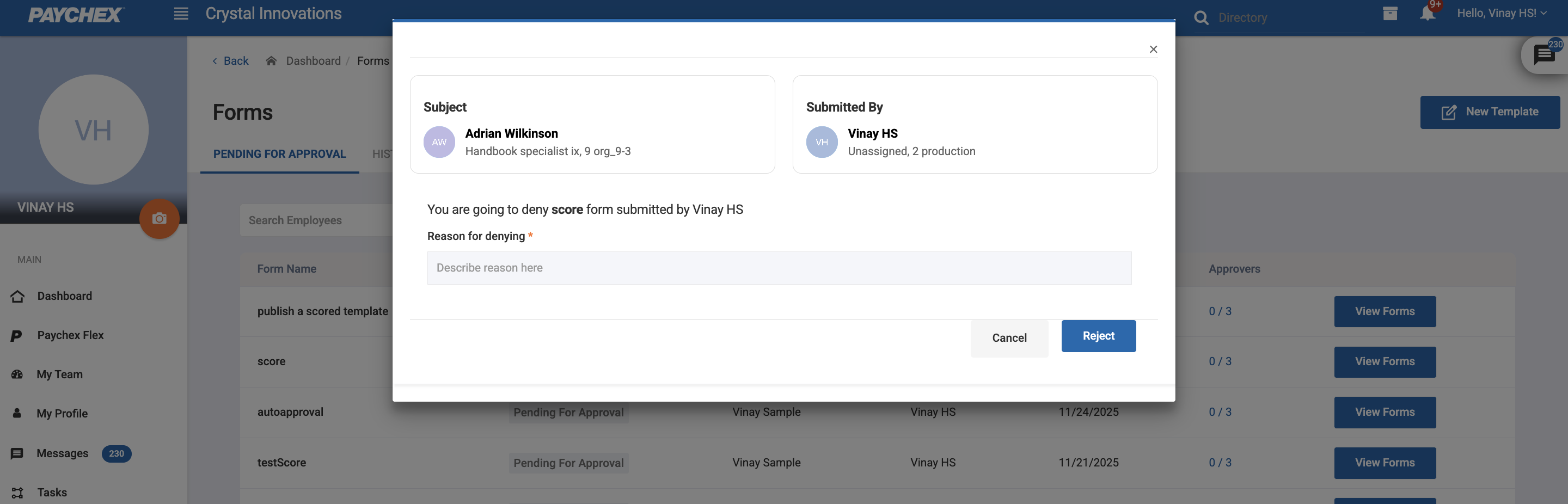 Forms that require approval (based on the template’s configuration) will appear in the Pending for Approval section for admins or designated approvers. Approvers can review the submitted form, verify the details, and take action using the Approve or Reject buttons.