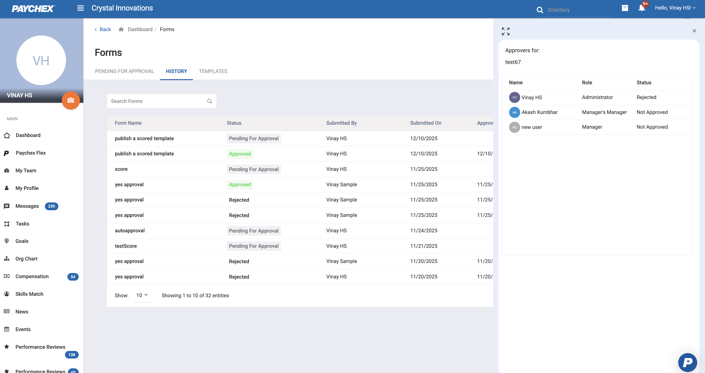 In the Pending for Approval or History list view, each form entry displays an Approvers column.