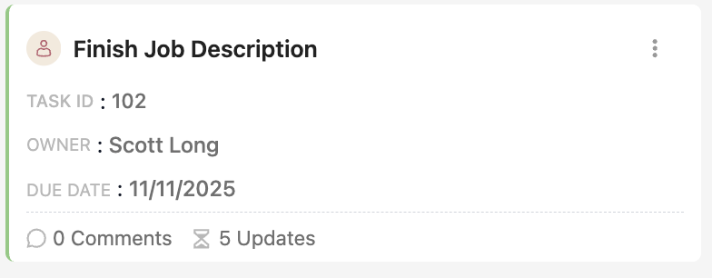 Icons and labels help identify task type (personal, team, workflow-driven) and visibility rules. Additionally card color stripe is based off of task priority.