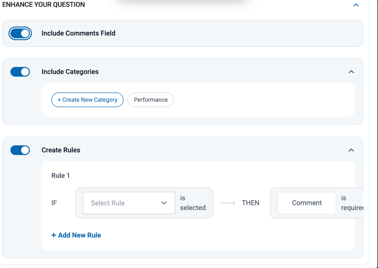 Questions can be configured with various formats, optional comment fields, categories, and response-based rules to capture more meaningful insights.