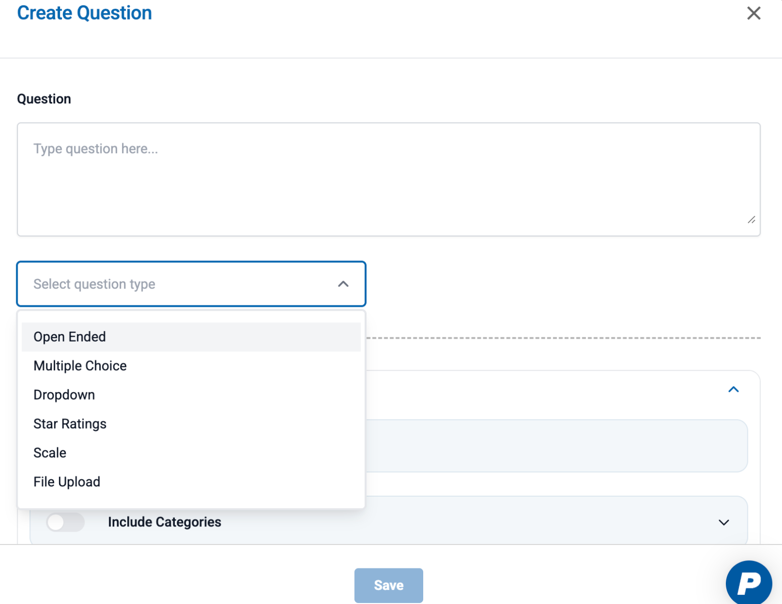 Categories can be added to any type of questions. These give admins an ability to group questions together under a common theme and then report on them later.