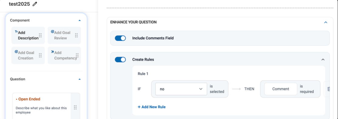 Create Rules: Set conditional logic (e.g., require comments if the lowest or highest score is selected).