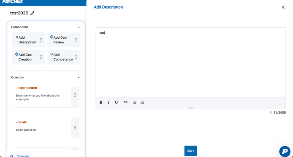 Add Description : The Add Description component is used to insert instructional or contextual text into the review template. This is a non-interactive section that does not require a response but helps guide reviewers by providing important information.