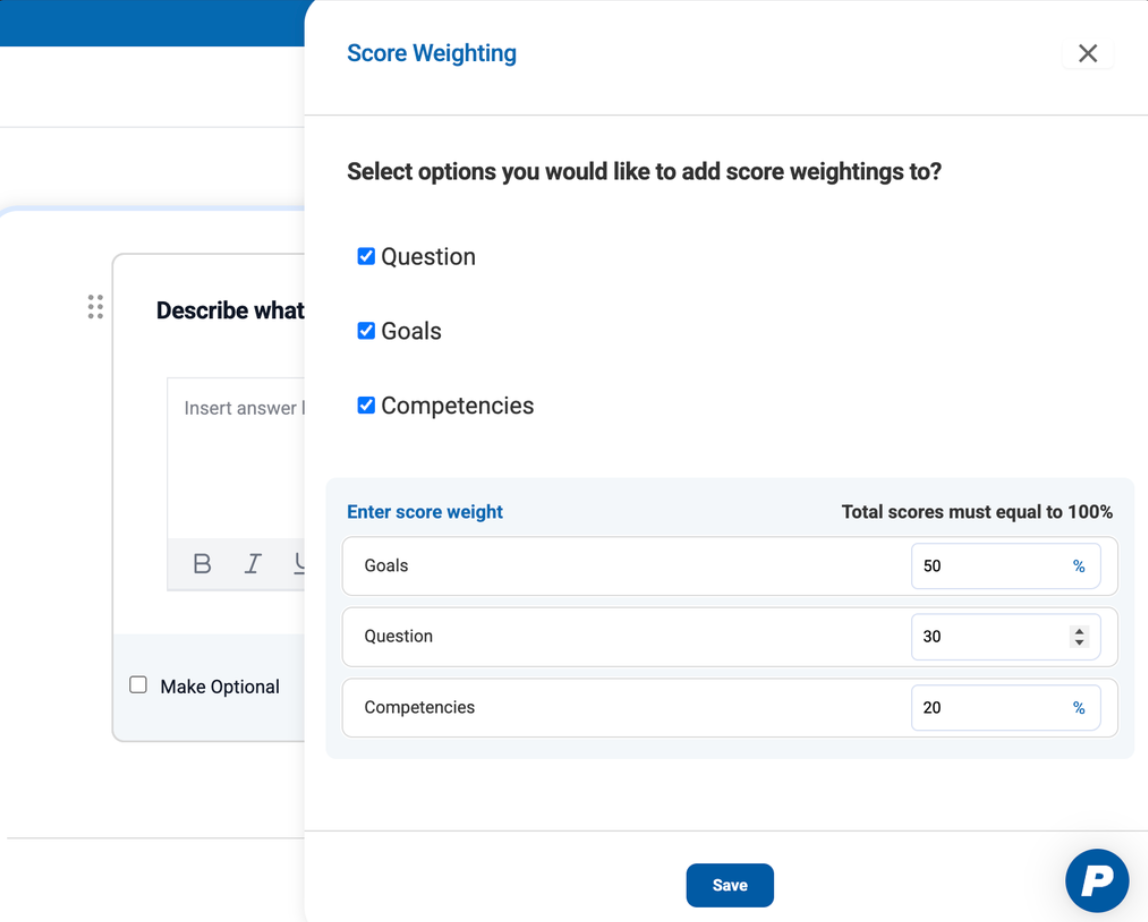 Choose how reviewers should assess the goals:Scale – Set a numeric range (e.g., 1 to 5)