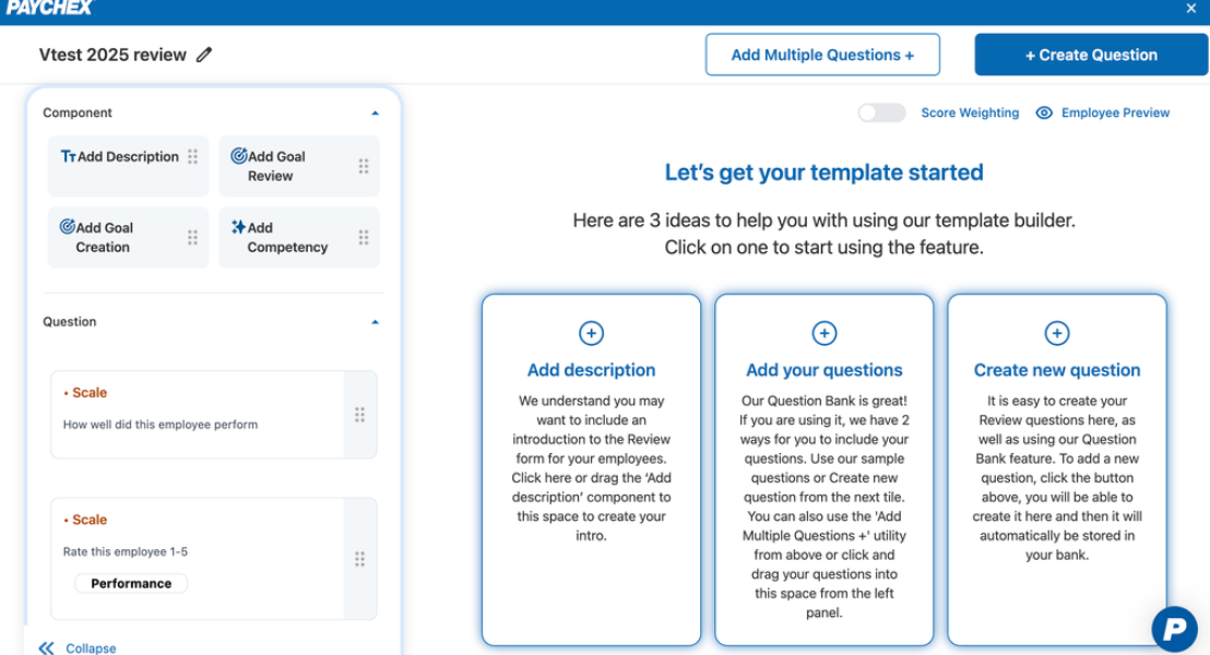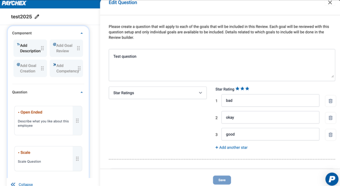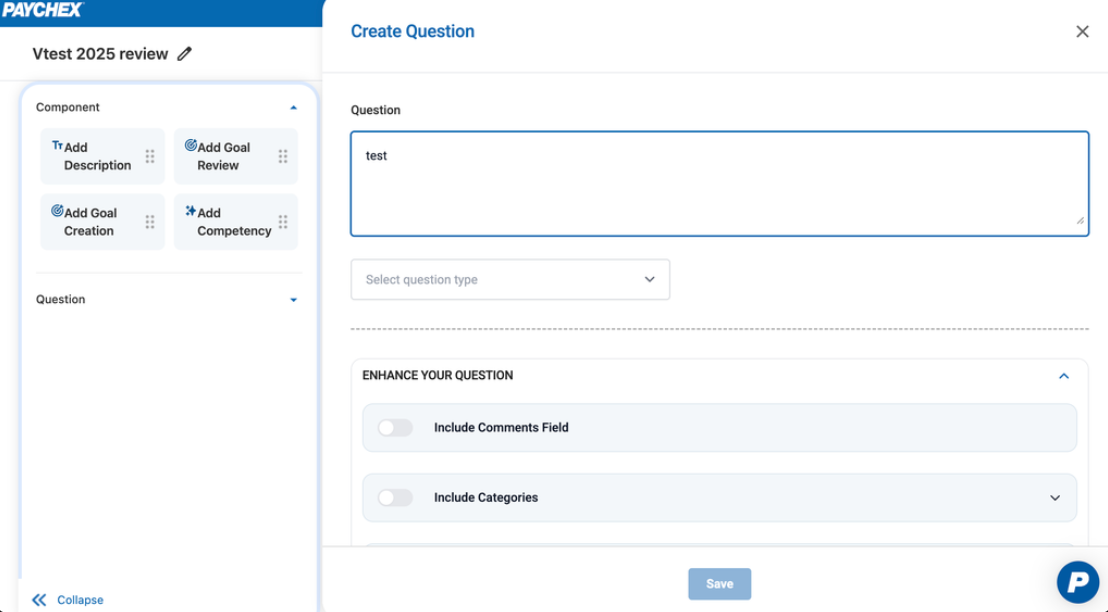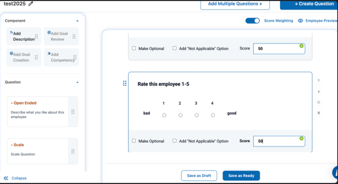 Add Goal Creation: The Add Goal Creation component inserts a designated section in the review template for employee goal entry or manager-assigned goals.