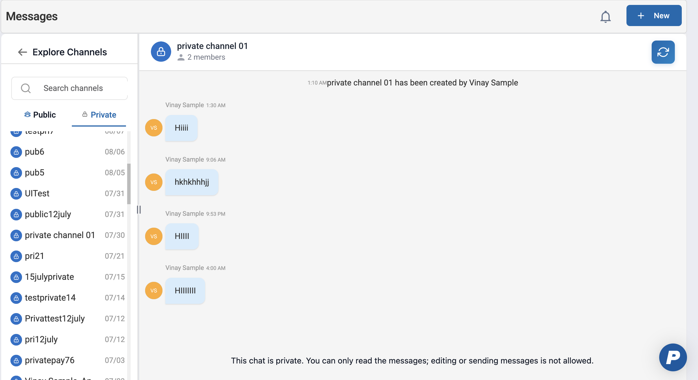 While viewing a private channel, click the Sync button in the top-right corner of the conversation detail.
