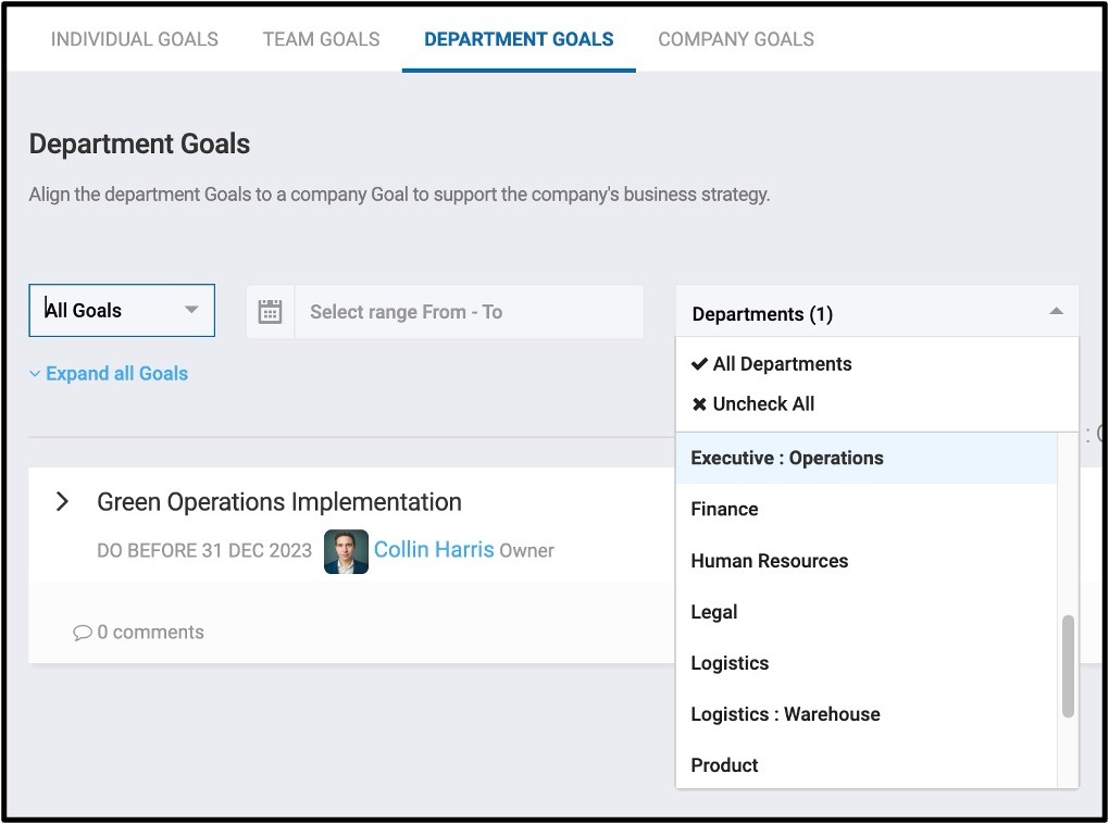 Department Goals are also accessible to the entire organization. When an employee clicks on the Department Goals tab, they will automatically see the goals for their specific department within the platform. However, employees can view goals for other departments by using the dropdown menu to select a different department.