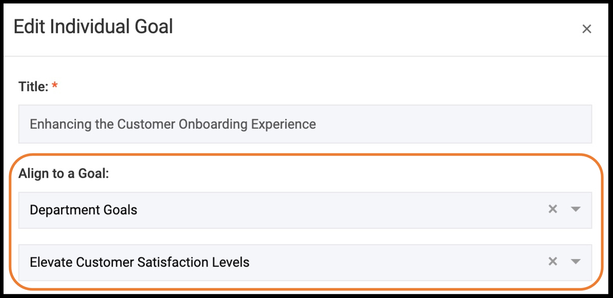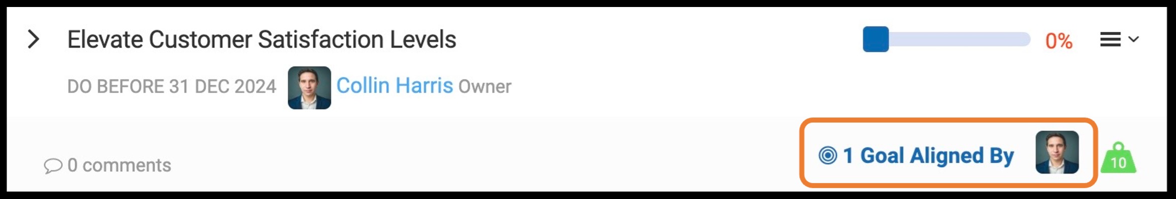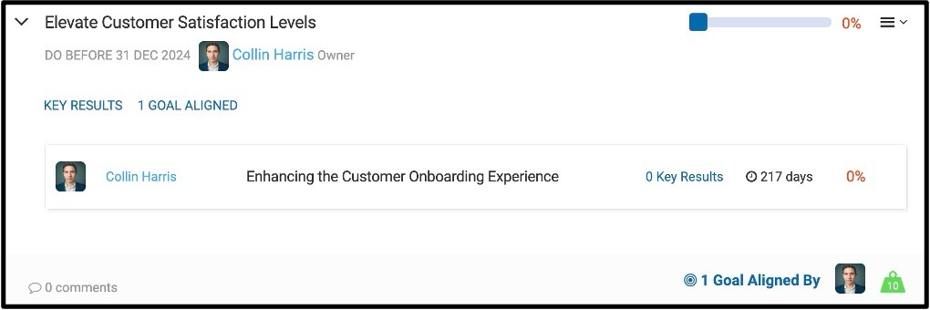 When creating the Individual Goal, Collin aligned this goal to a goal that his Department is currently working on, titled "Elevate Customer Satisfaction Levels".