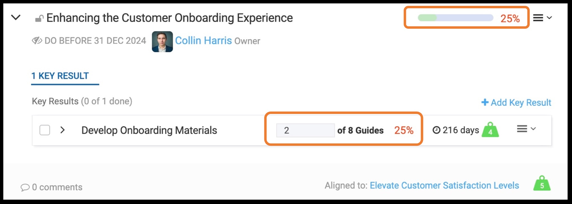For example, Collin has created and distributed two (2) onboarding guides thus far out of his total goal of creating and distributing a total of eight (8) onboarding guides.
