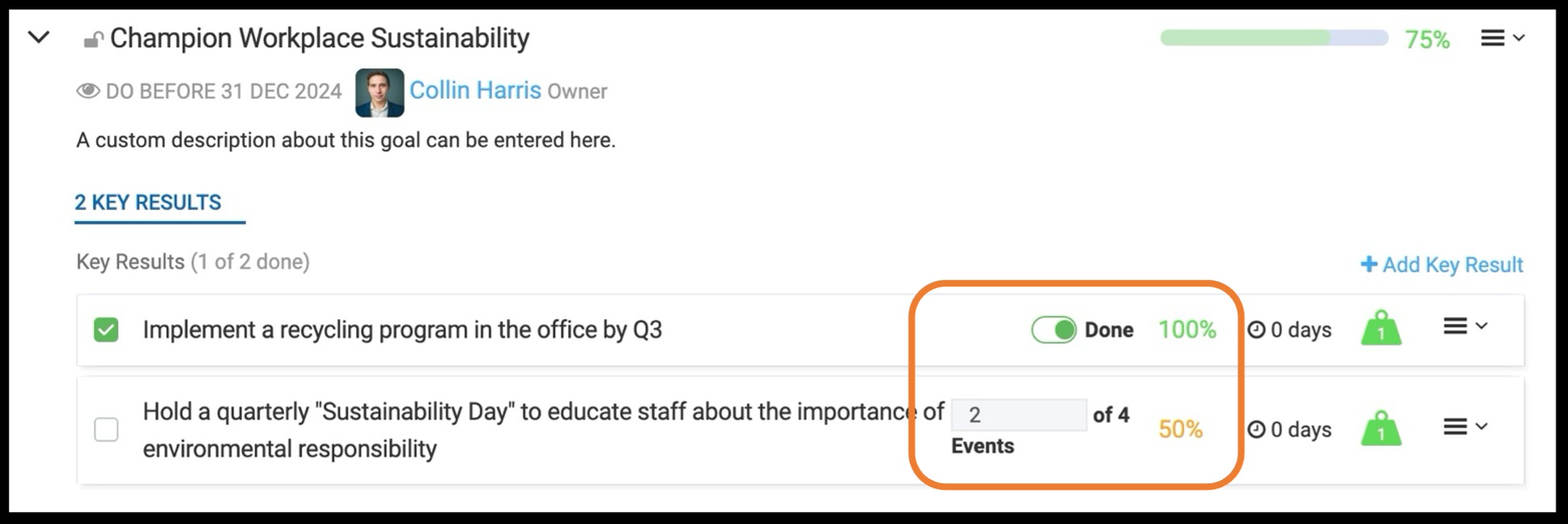 If the goal has Key Results attached to them, the progress from the Key results will factor into the overall goal completion.