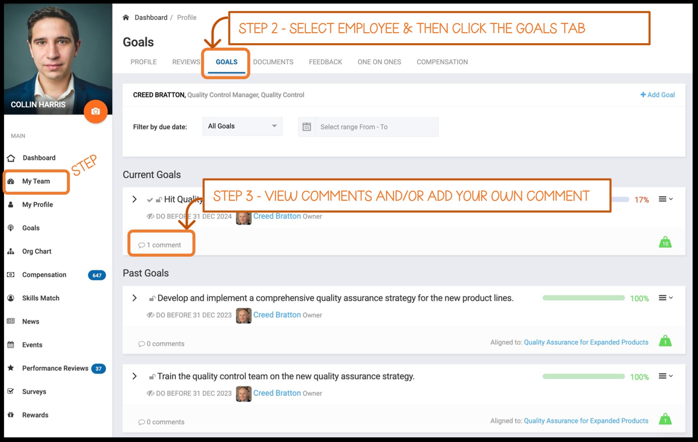 Here you will see both Current and Past Goals with a quick-view of each due date, completion percentage, and weighting.